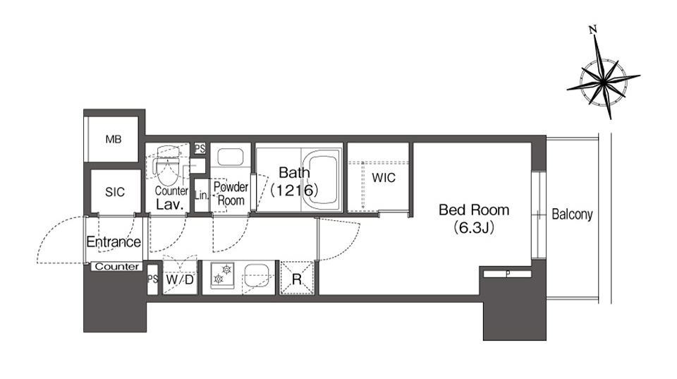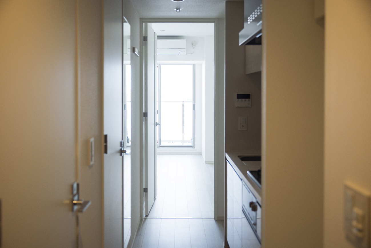 ダブルロックの玄関扉を開けるとバルコニーに向かって、右手にキッチン、左手にトイレと洗面所、バスルームが一列に並び、一番奥が居室(ベッドルーム)。