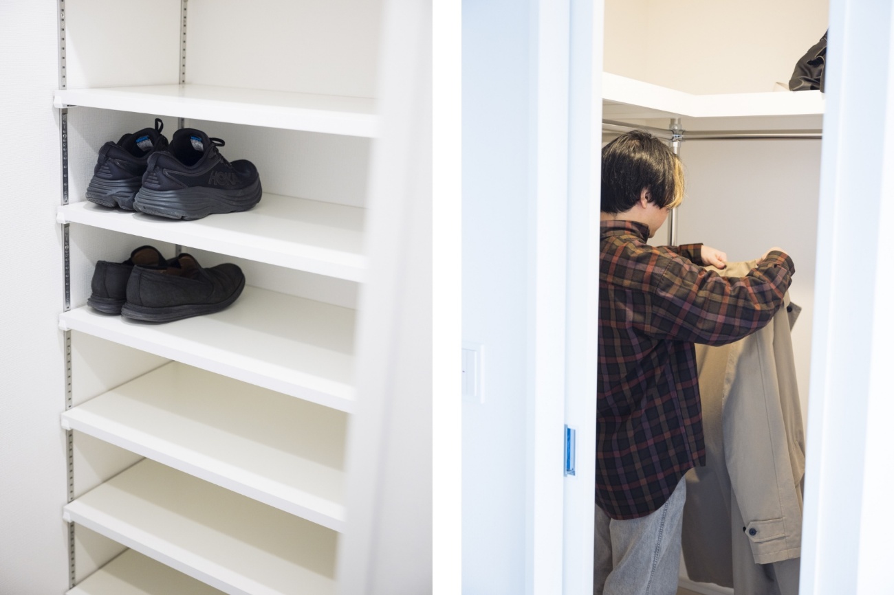 左がシューズクローゼットで、右がウォークインクローゼット。手持ちの靴もコートもすっぽりハマり、「ここに住んだら~」とイメージが膨らむ