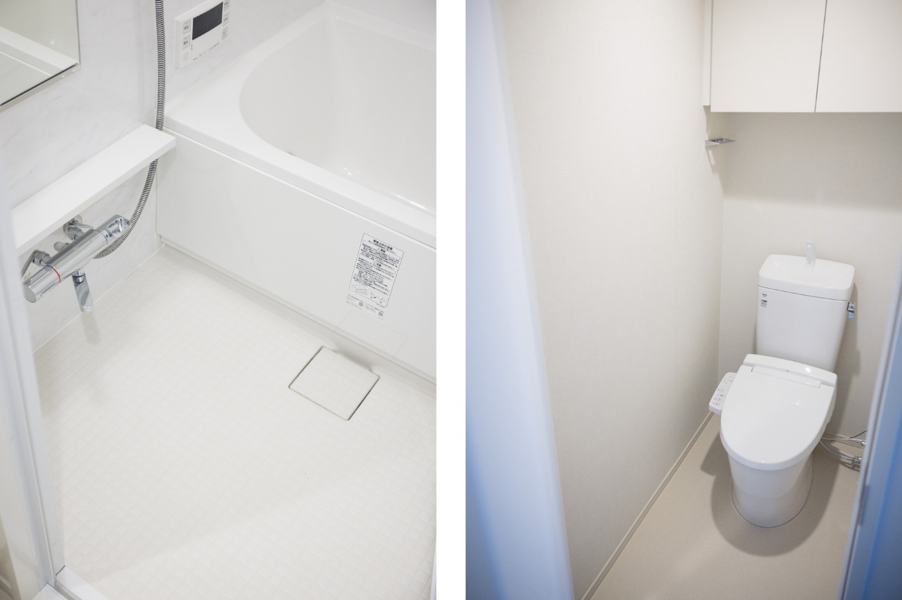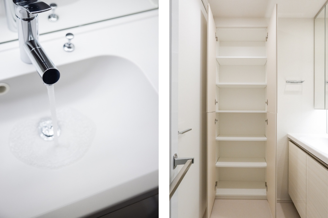 水回りは、独立洗面台、追焚機能と浴室乾燥機を備えたバスルーム、温水洗浄便座を備えたトイレを標準装備。こちらも収納たっぷりで清潔、機能的、言うことなし。