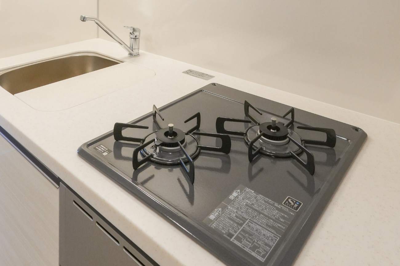 キッチンはコンパクトながら、コンロが2口あって自分で調理するぶんには十分。キッチンの横にはnoifulで借りるドラム式洗濯乾燥機を、そして反対側には、これまたnoifulで借りる冷蔵庫と電子レンジを置こう。家電によってはいろいろなスペックがあるから、自分のライフスタイルに合ったものを選べるのもうれしい。