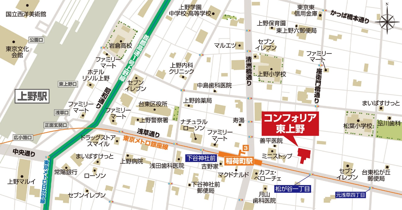 浅草通りから一本入ると、見えてきました「コンフォリア東上野」。左の写真で、高くて白い建物です。銀座線稲荷町駅から徒歩3分、あっという間に到着。