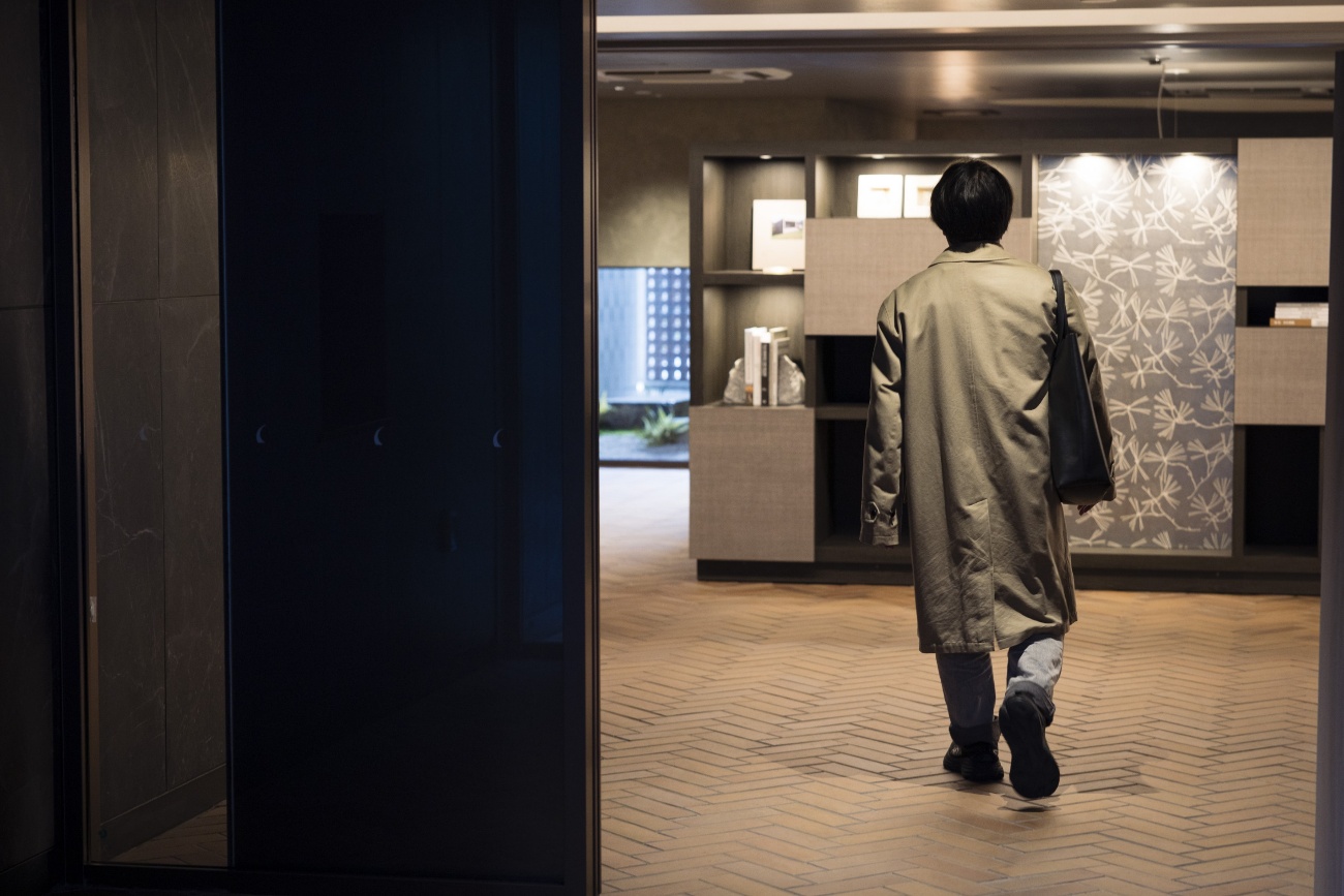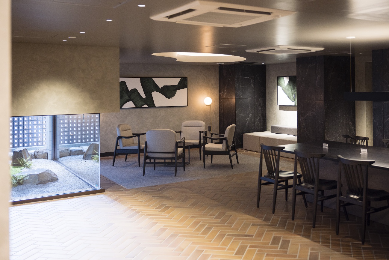 エントランスを正面に進むと、共用のラウンジスペースが広がります。落ち着いた照明が心地よく、左手の、トップライトが降り注ぐ坪庭がアクセントに。どこかホテルのラウンジのような雰囲気を演出しているのは、座面が低くリラックスできるイージーチェアのおかげ。しかもフリーWi-Fiとコンセントまで用意があるというのだから、自室での仕事が煮詰まったとき、カフェやコワーキングスペースに行かなくてもここを活用できそうじゃないか。