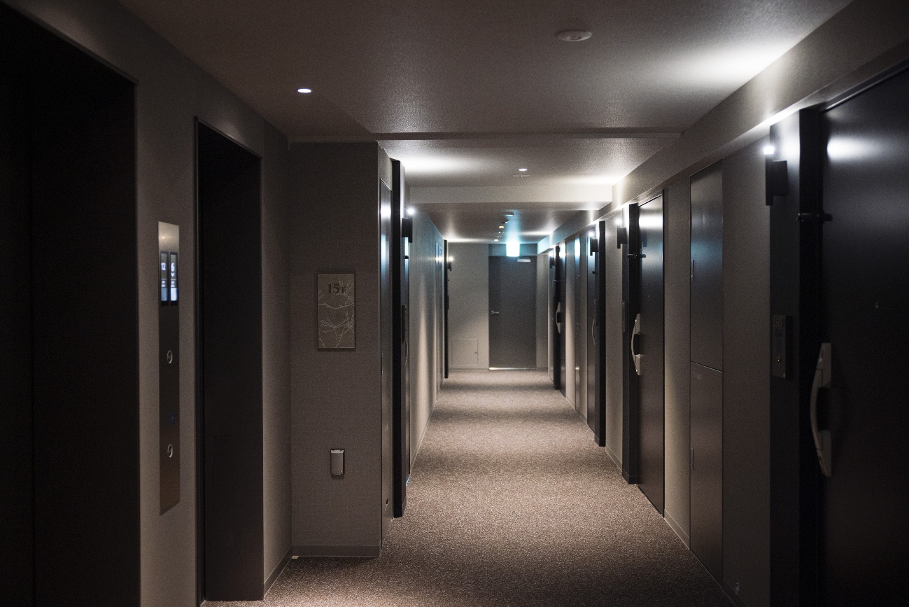 マンション全体は内廊下で、照明をほどよく落としてあり、居住者同士が廊下ですれ違った際のプライバシーに配慮している模様。ホテルライクな空間で、個人的にこのコロンとした照明が気に入りました。かわいい。