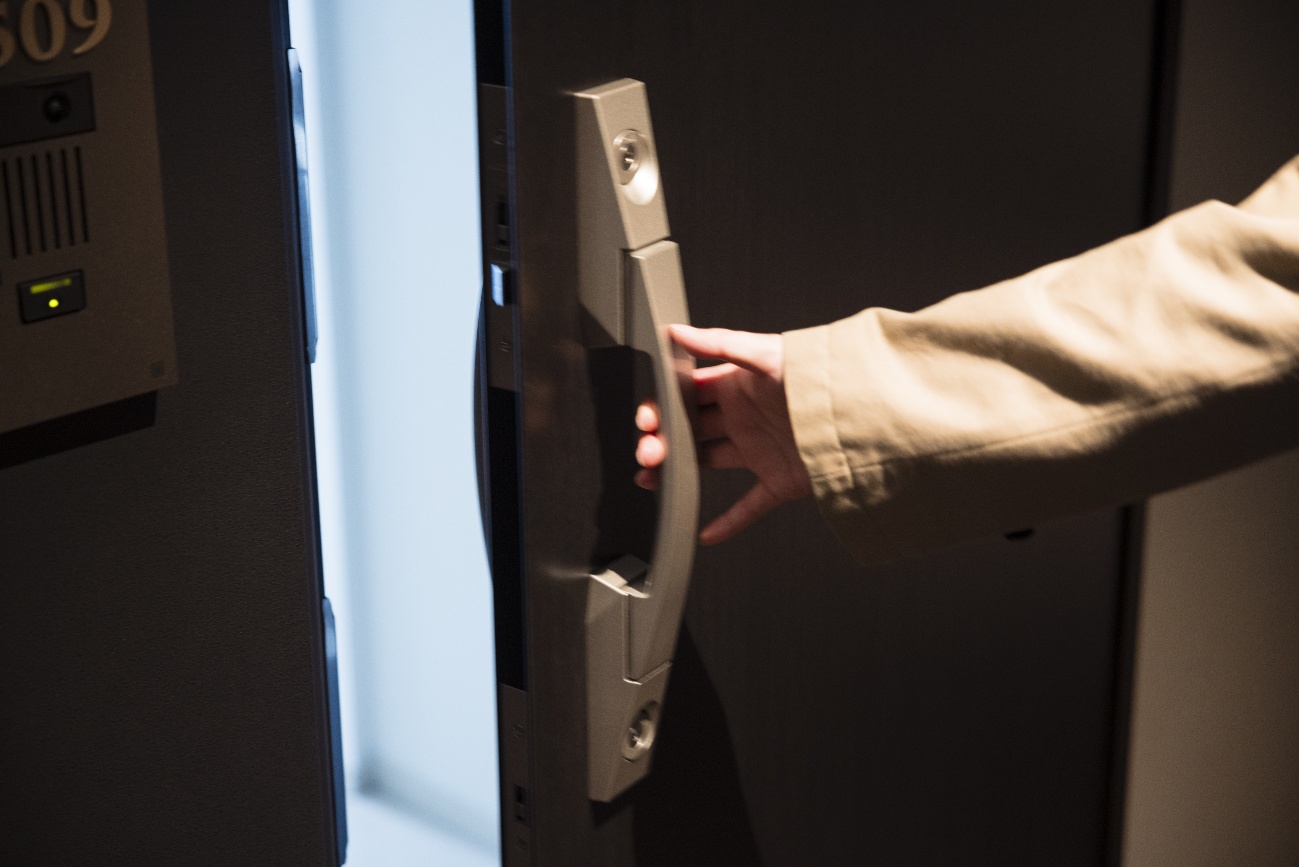 ではさっそく、エントランスからお邪魔します。キーをカバンやポケットに入れたままで扉が開くハンズフリーを採用しているので、鍵をバッグのなかで行方不明にしがちな人(自分)にはありがたい限り。