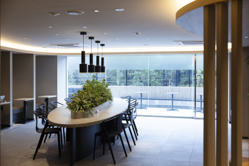 最後に、充実していると聞いた共用施設を拝見しよう。まずエントランス入ってすぐそばに広がる「オープンサロン」。中央には目にやさしいグリーンをあしらったデスク、パーテーションで区切られたワークスペースや少人数の打ち合わせが可能なボックスシートがある。