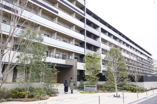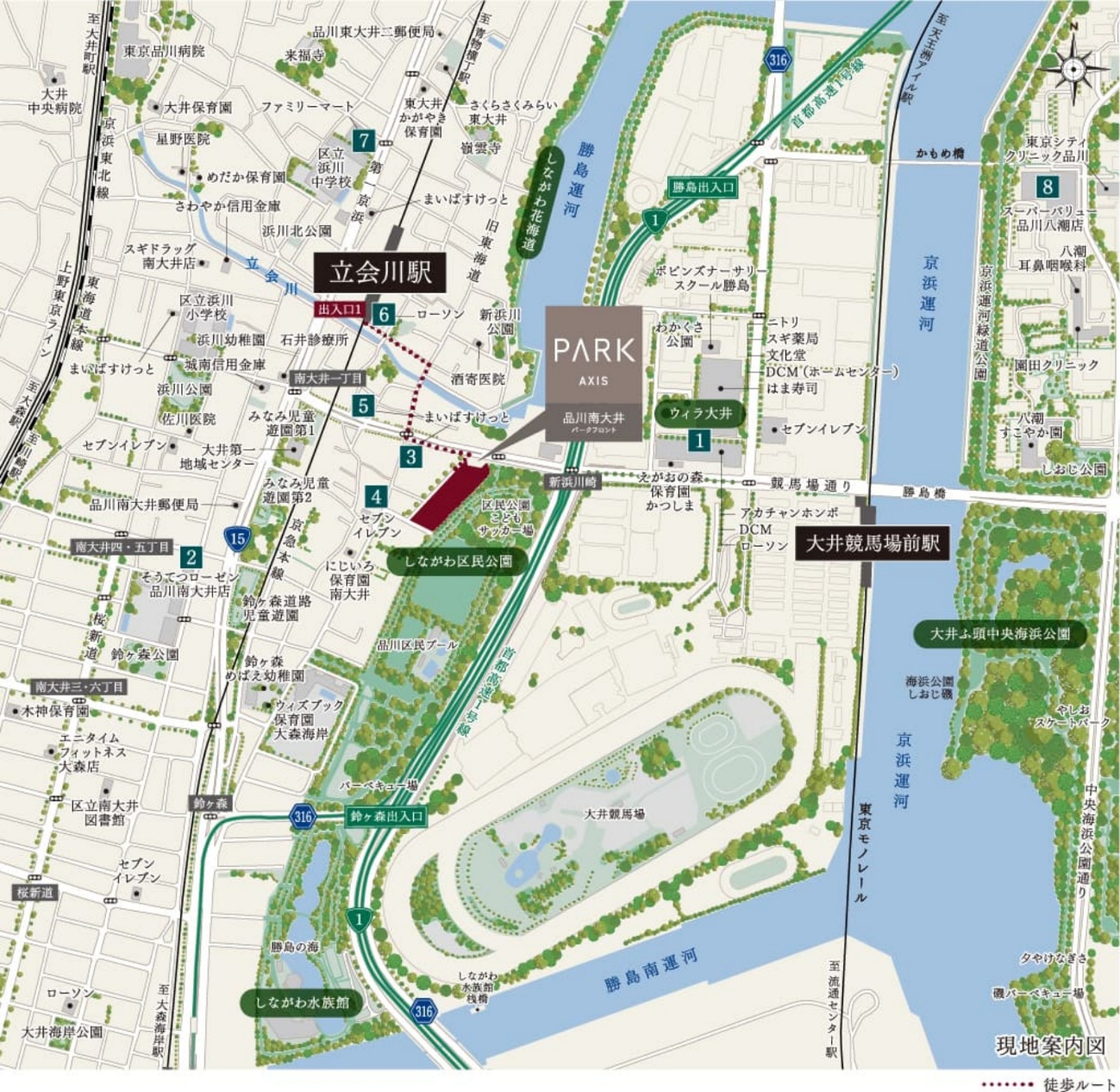 立会川を渡って、旧東海道を進み競馬場通りを横切ると見えてくるのが「パークアクシス品川南大井パークフロント」。想像していたより、ずっと大きい!地上8階、全324戸。その名の通り、東側の「しながわ区民公園」に隣接して建ち、さらにその隣には「しながわ水族館」もある。メガターミナル駅の品川駅や空の玄関、羽田空港へのアクセスも良いのにこれだけ自然がある場所もめずらしい気がする。