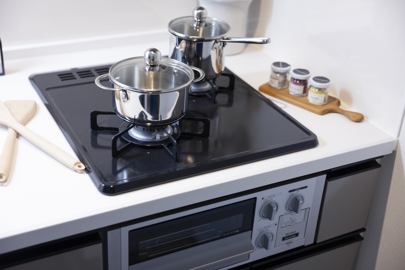 調理台とグリル付きの2口ガスコンロを備え、時短料理も効率的に作れそう!