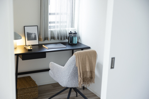 リビングの奥右手には、約3畳のワークスペースが。仕事道具やオンな雰囲気をリビングには持ち込みたくないから、これは嬉しい。引戸なので、戸を閉めればオンライン会議対応もできるし、戸を開ければリビングを広々と拡張できる。