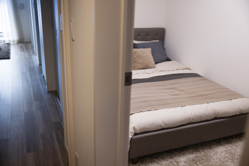 さて、ほかの部屋も見てみよう。玄関を入って右手にあるベッドルームは、ダブルベッドがぴったり入る広さ。