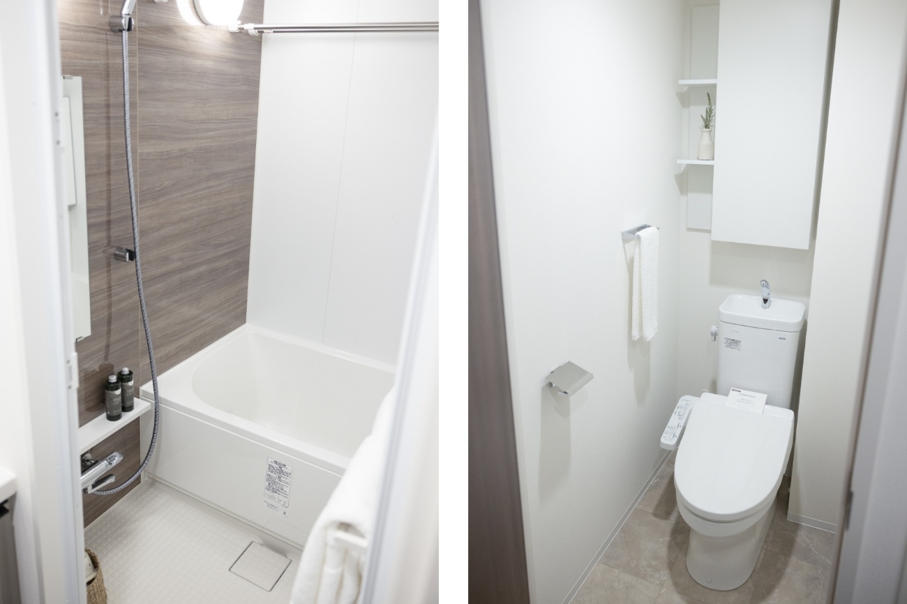 浴室にはウッド調パネルが配され、水回りが清潔なだけではなく落ち着いた表情だ。トイレは収納+飾り棚。ここ、ひとり暮らしだったらフレグランスや本を置いちゃうんだけど、彼女はどうだろう?
