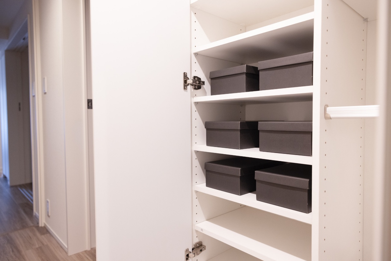 玄関脇のシューズクローゼットは、省スペースながら靴や持ち物に合わせて高さを変えられる。靴だけでなく、工具とかちょっとした生活用品を入れておくにもぴったり。